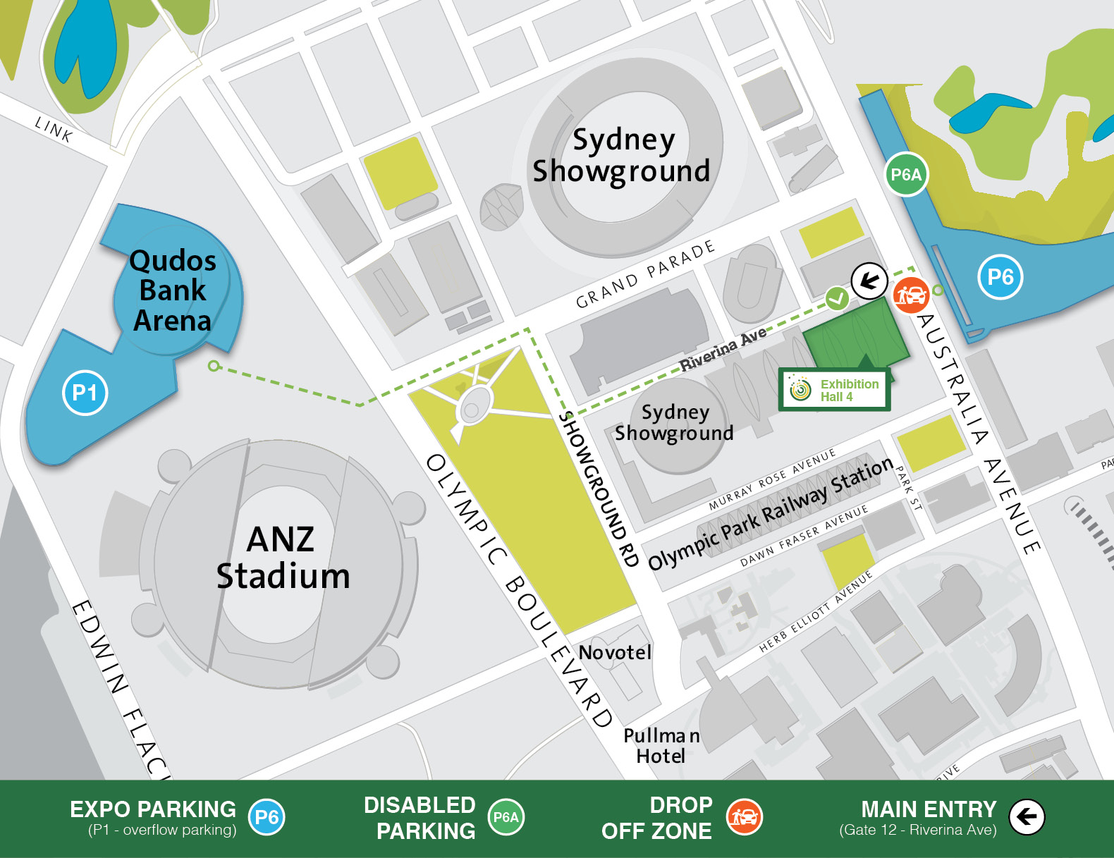 Sydney Showgrounds, Sydney Olympic Park has accessible and mobility car parking spaces for people with disability. There are on-street accessible spaces on Showground Road, Herb Eliott Avenue and Dawn Fraser Avenue west (check signs for time-limits).